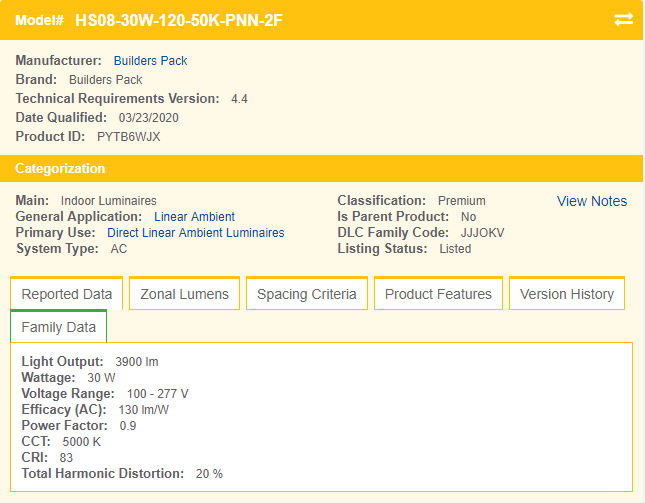 | 30-26018-XX | HS08-30W-120-XXK-PNN-2F | 4' | 30W | 30K,35K,40K, 50K | 130 lm/W | 3900lm | 85 | 100-277V | Spec Sheet |