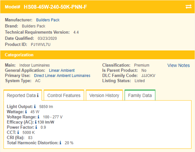 | 30-26016-XX | HS08-45W-240-XXK-PNN-F | 8' | 45W | 30K,35K,40K, 50K | 130 lm/W | 5850lm | 85 | 100-277V | Spec Sheet |