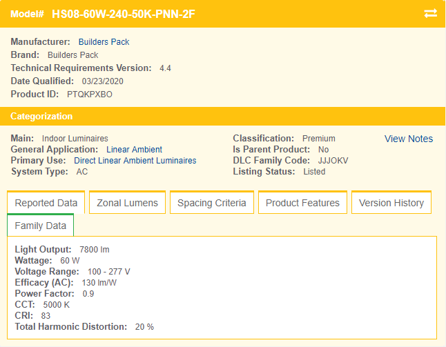 | 30-26017-XX | HS08-60W-240-XXK-PNN-2F | 8' | 60W | 30K,35K,40K, 50K | 130 lm/W | 7800lm | 85 | 100-277V | Spec Sheet |